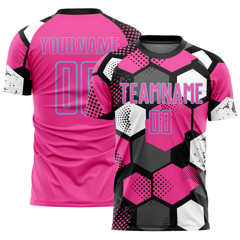 Custom Black Pink Light Blue-White Geometric Shape Sublimation Soccer Uniform Jersey