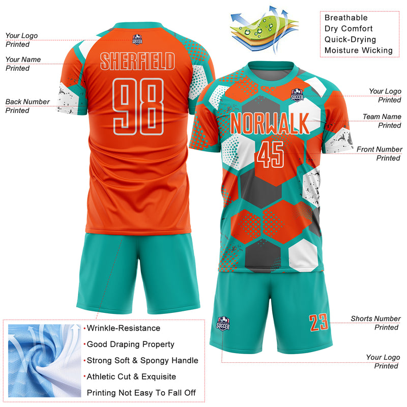 Custom Aqua Orange-White Geometric Shape Sublimation Soccer Uniform Jersey