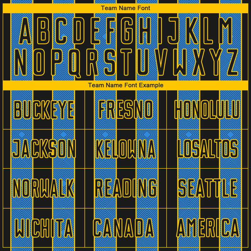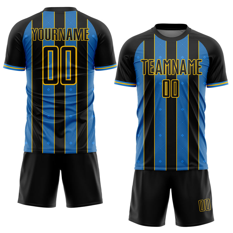 Custom Black Powder Blue-Yellow Pinstripe Line Sports Sublimation Soccer Uniform Jersey