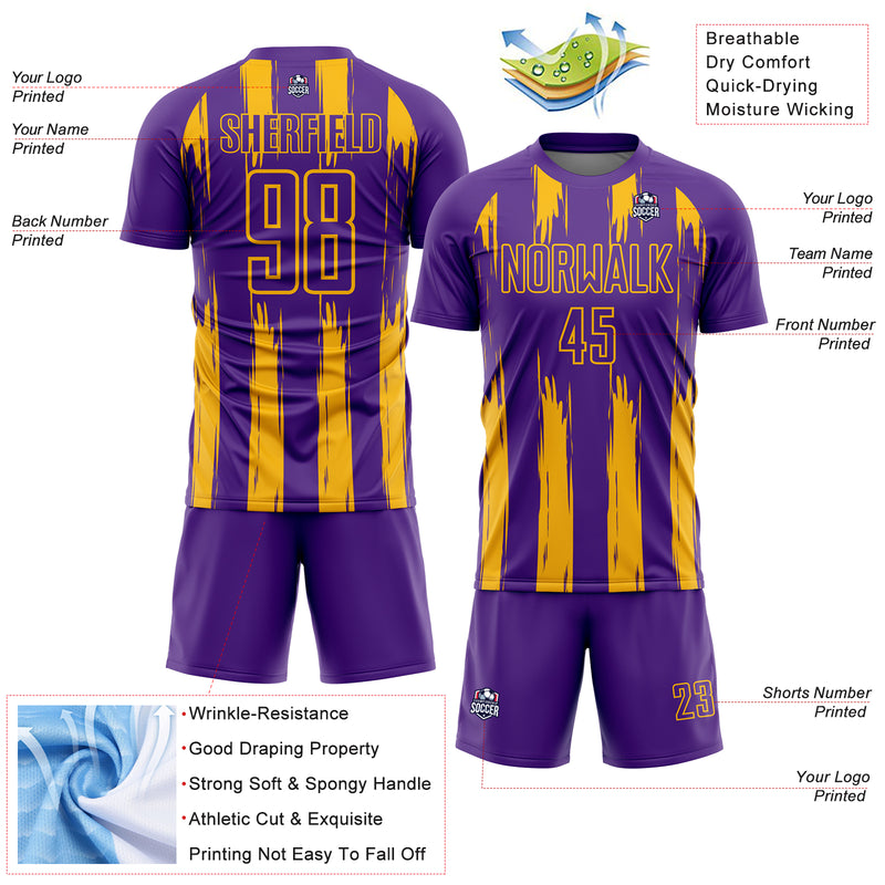 Custom Purple Gold Abstract Stripes Sublimation Soccer Uniform Jersey