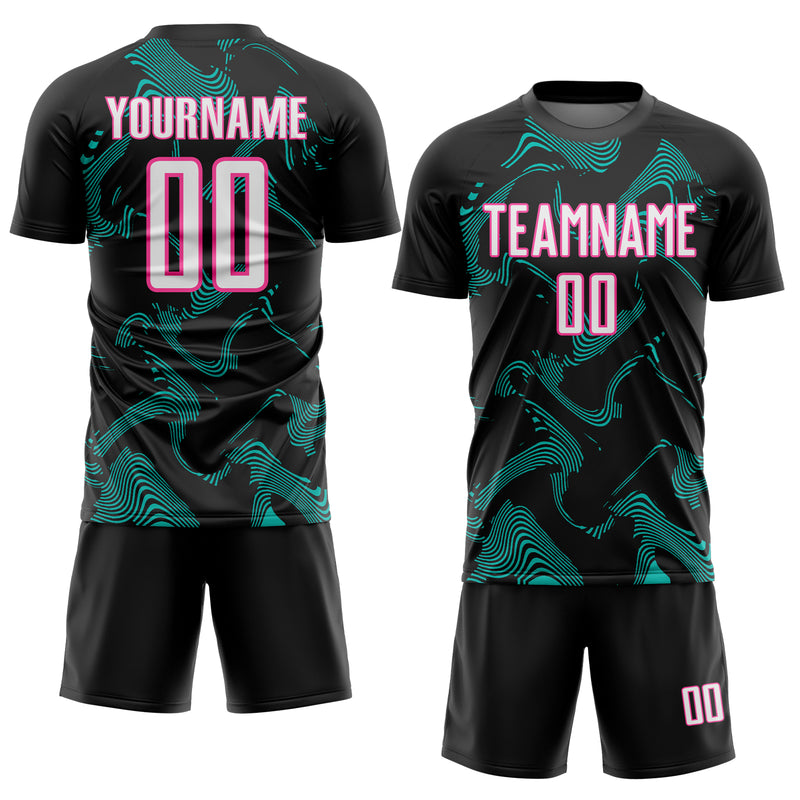 Custom Black White Aqua-Pink Curve Lines Sports Sublimation Soccer Uniform Jersey