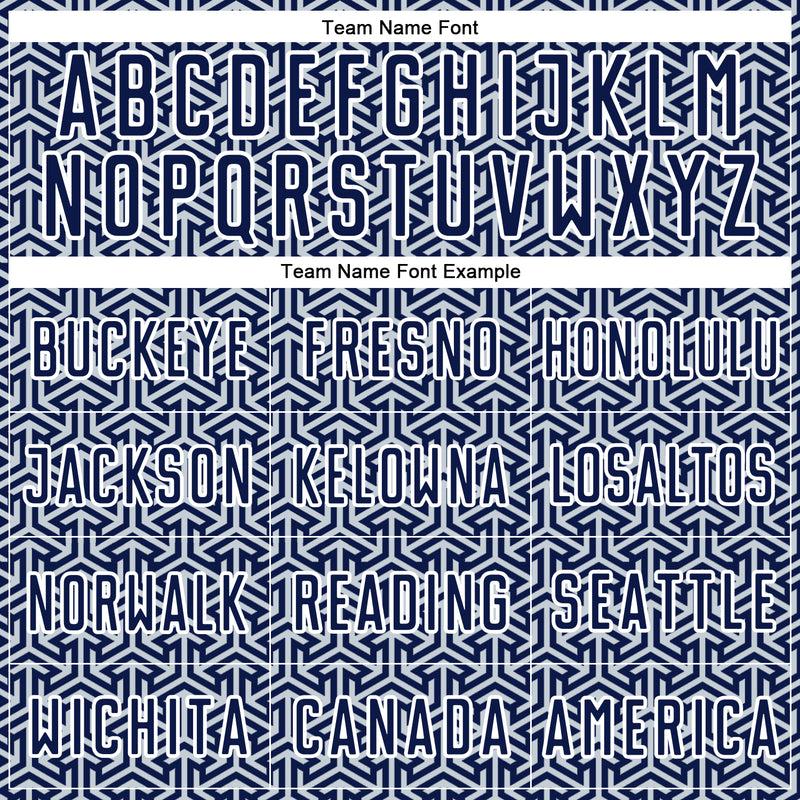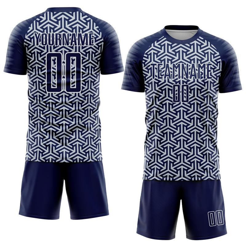 Custom Navy Silver-White Geometric Arrow Sublimation Soccer Uniform Jersey