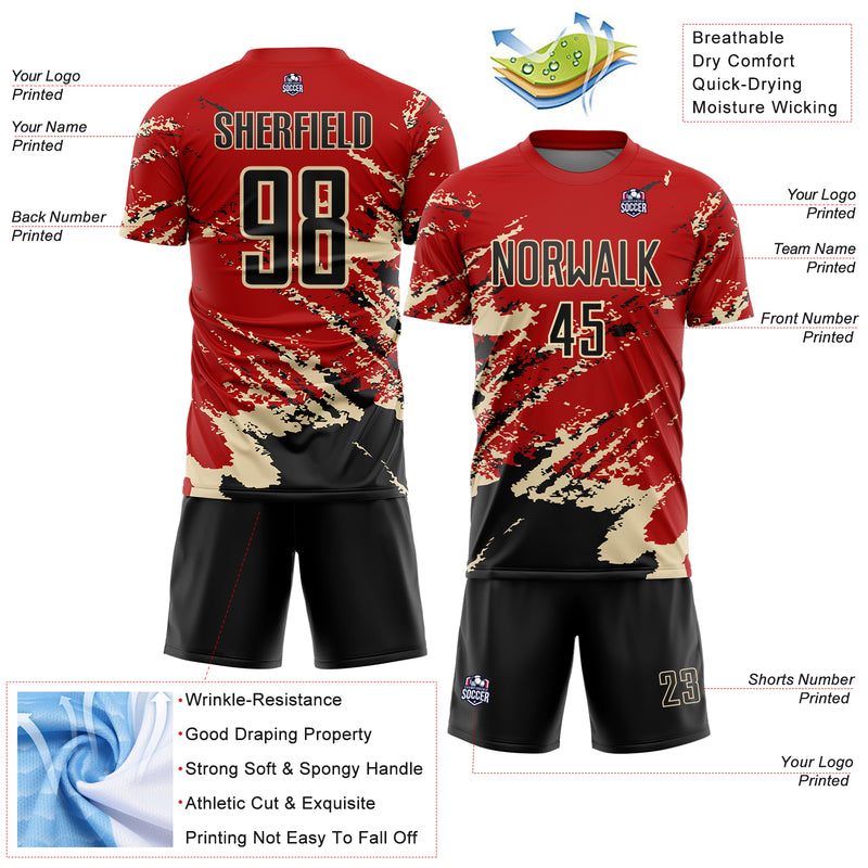 Custom Red Black-Cream Abstract Fragment Art Splash Sports Sublimation Soccer Uniform Jersey