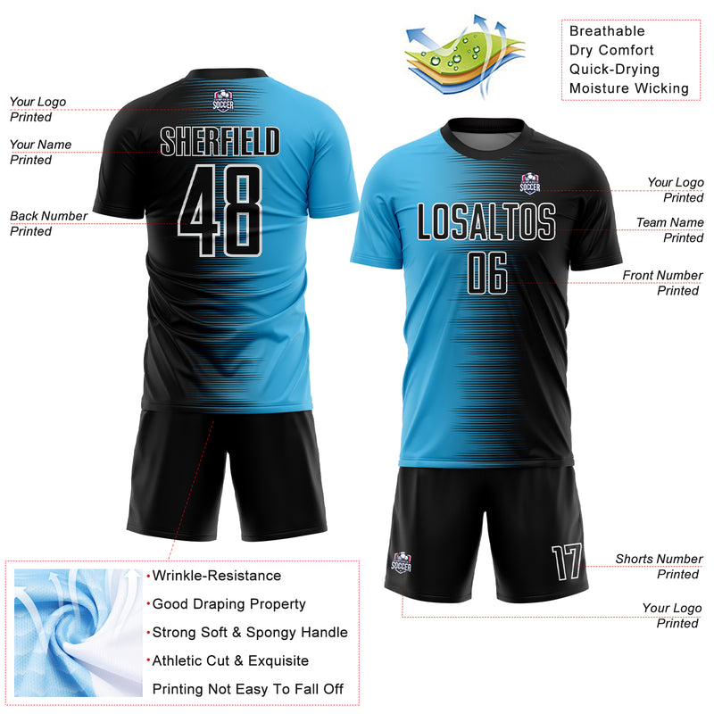 Custom Black Sky Blue-White Gradient Line Sublimation Soccer Uniform Jersey