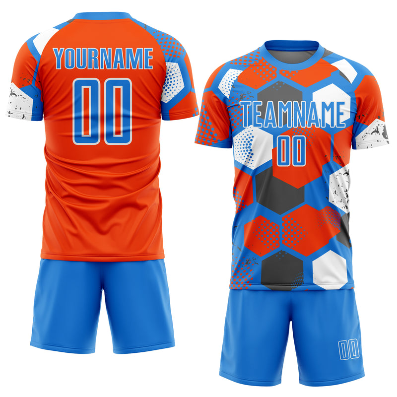 Custom Powder Blue Orange-White Geometric Shape Sublimation Soccer Uniform Jersey