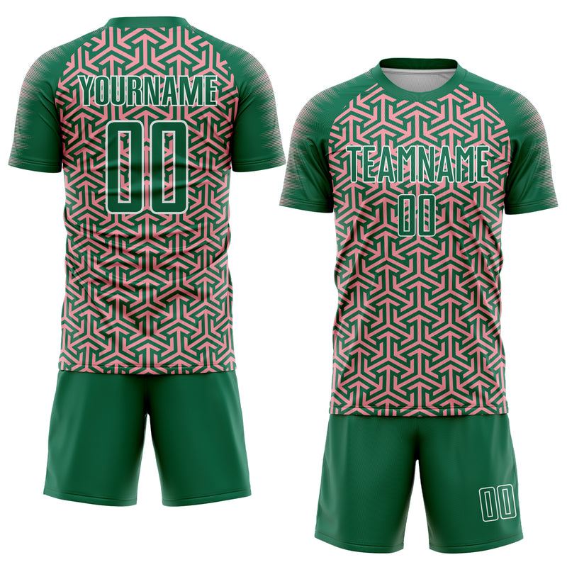 Custom Kelly Green Medium Pink-White Geometric Arrow Sublimation Soccer Uniform Jersey