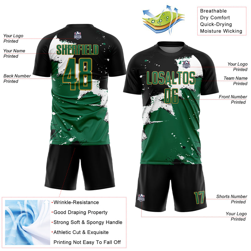 Custom Black Kelly Green-Old Gold Spalsh Sublimation Soccer Uniform Jersey