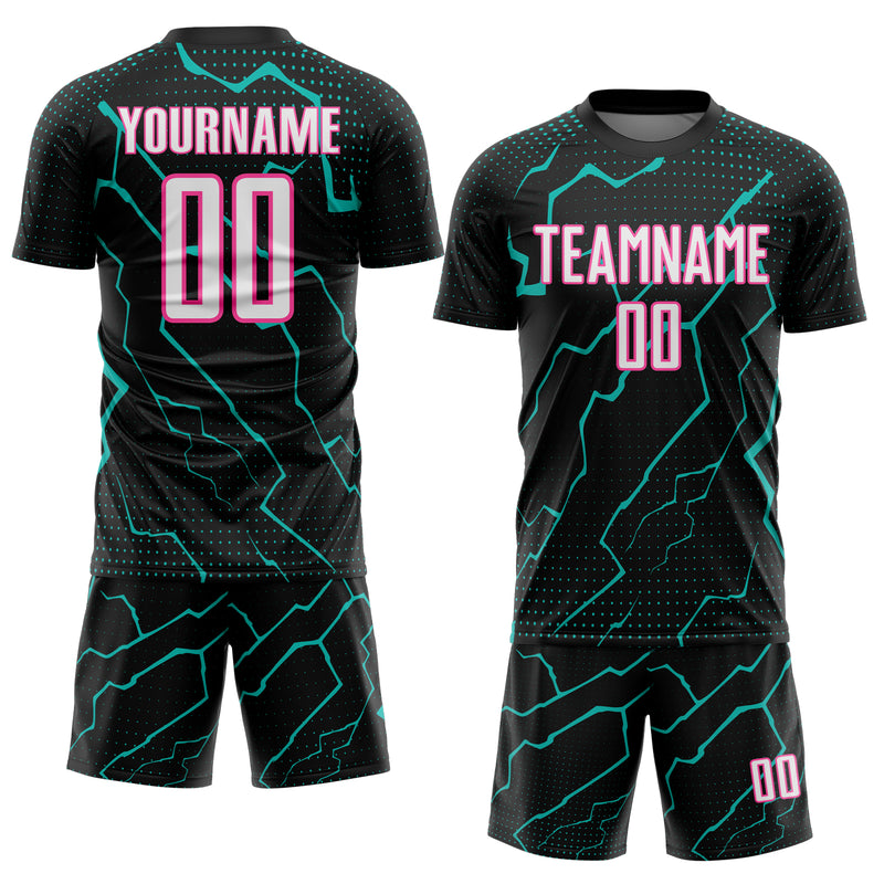 Custom Black White Aqua-Pink Lightning Sports Sublimation Soccer Uniform Jersey