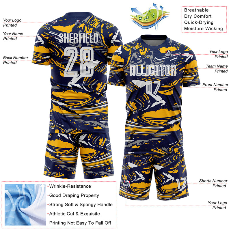 Custom Figure White Navy-Gold Fluid Art Splash Sublimation Soccer Uniform Jersey