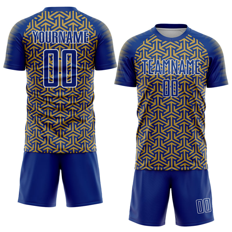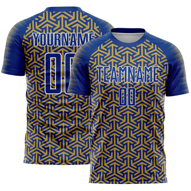 Custom Royal Old Gold-White Geometric Arrow Sublimation Soccer Uniform Jersey
