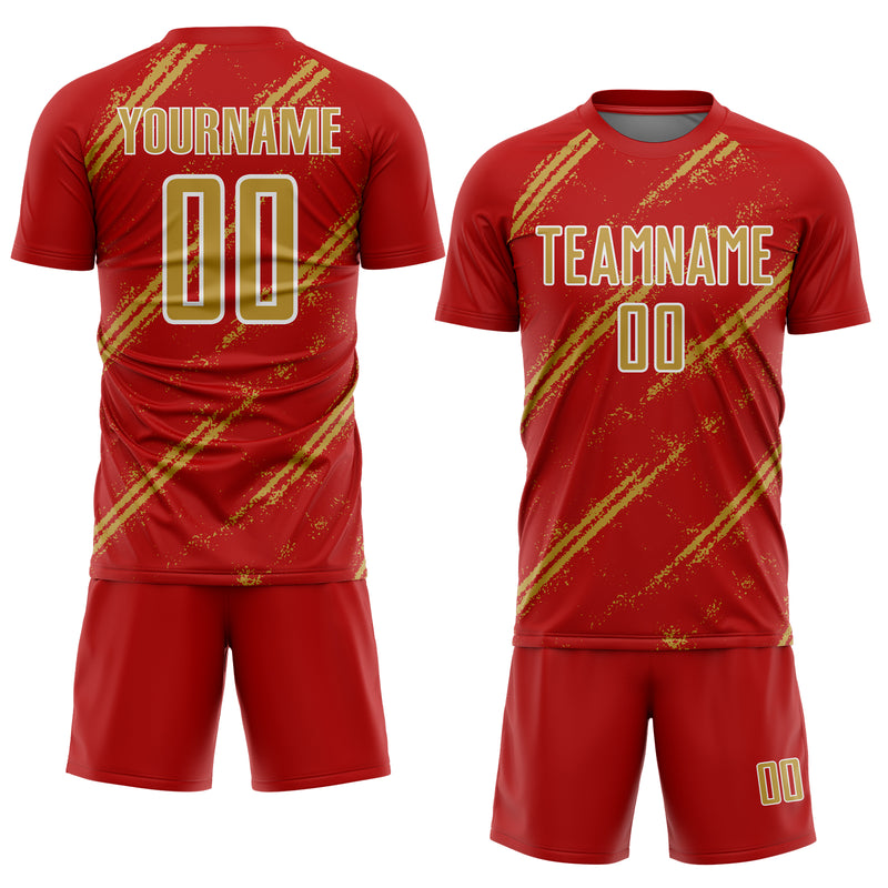 Custom Red Old Gold-White Abstract Fragment Art Splash Sublimation Soccer Uniform Jersey