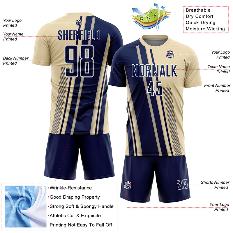 Custom Cream Navy-White Lines Sports Sublimation Soccer Uniform Jersey