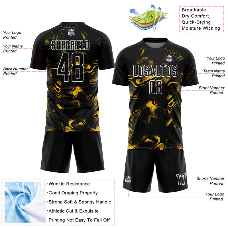 Custom Black Yellow-White Abstract Liquid Sublimation Soccer Uniform Jersey