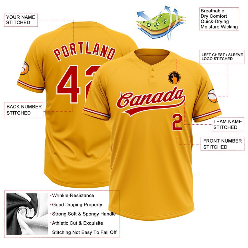 Custom Gold Red-White Two-Button Unisex Softball Jersey