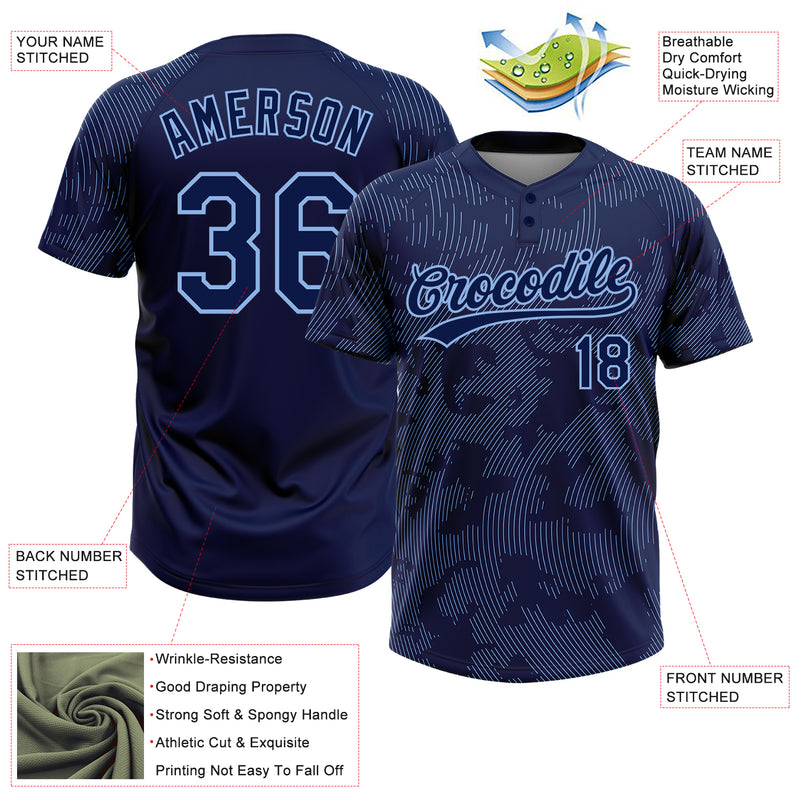 Custom Navy Light Blue 3D Pattern Curve Lines Two-Button Unisex Softball Jersey