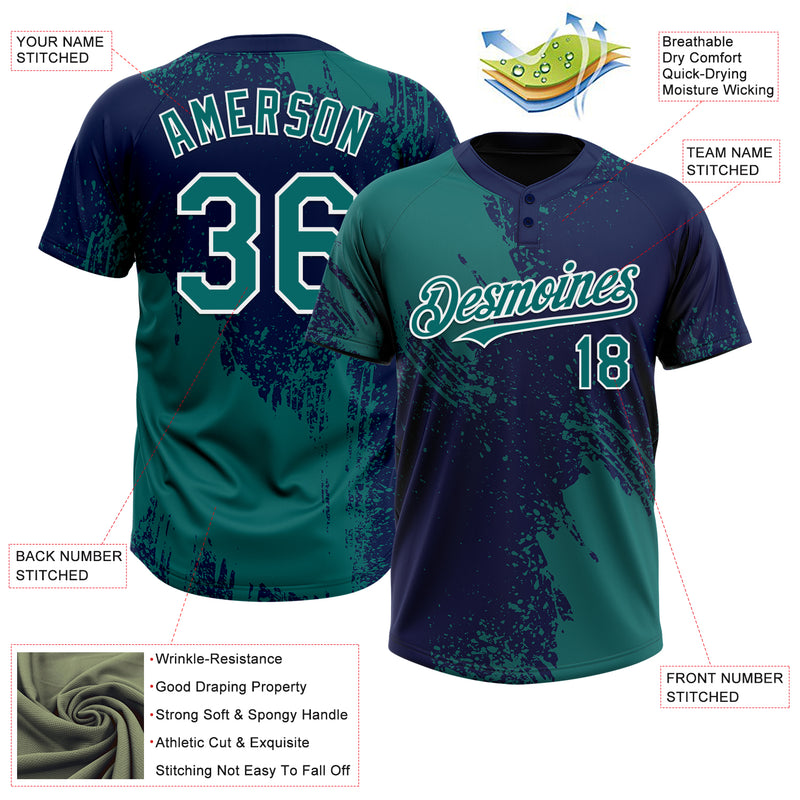 Custom Teal Navy-White 3D Pattern Abstract Brush Stroke Two-Button Unisex Softball Jersey