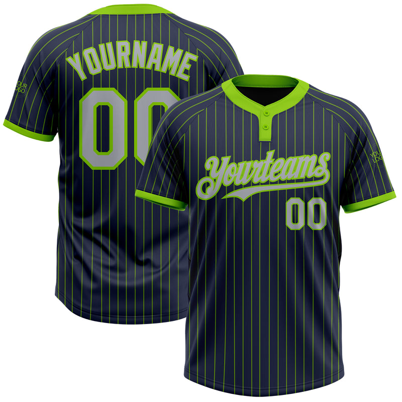 Custom Navy Neon Green Pinstripe Gray Two-Button Unisex Softball Jersey