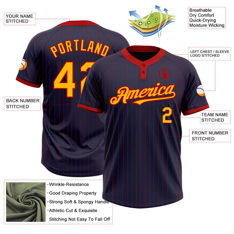 Custom Navy Red Pinstripe Gold Two-Button Unisex Softball Jersey