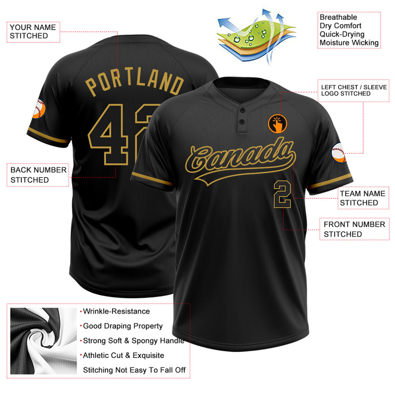 Custom Black Black-Old Gold Two-Button Unisex Softball Jersey