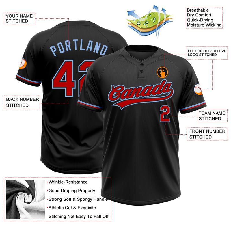 Custom Black Red-Light Blue Two-Button Unisex Softball Jersey