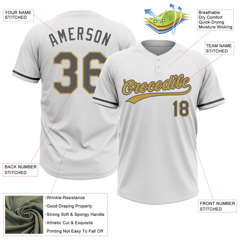 Custom White Steel Gray-Old Gold Two-Button Unisex Softball Jersey