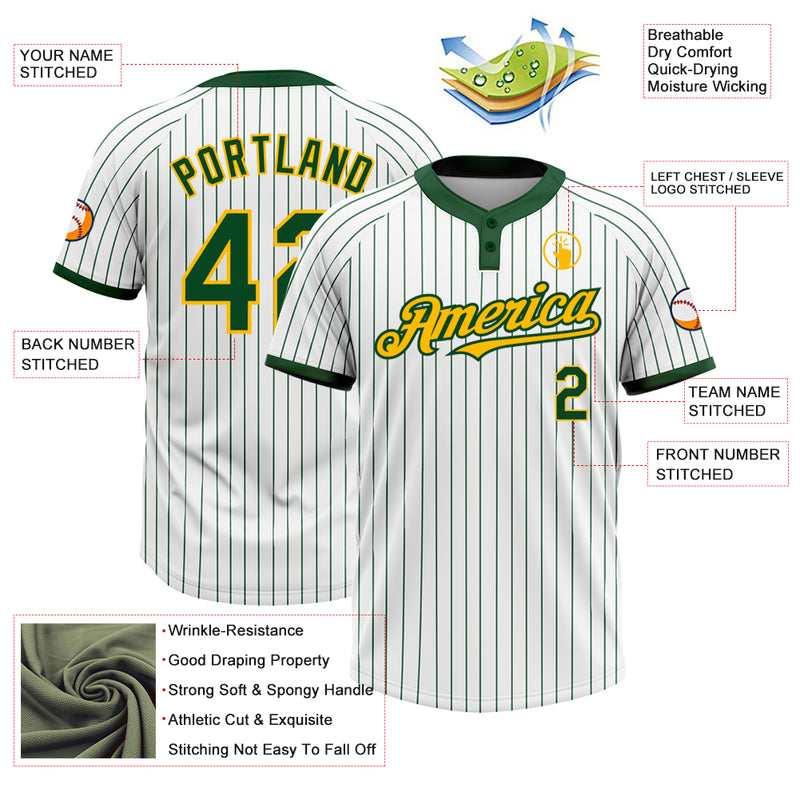 Custom White Green Pinstripe Gold Two-Button Unisex Softball Jersey