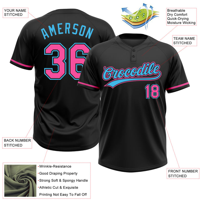 Custom Black Pink-Sky Blue Two-Button Unisex Softball Jersey