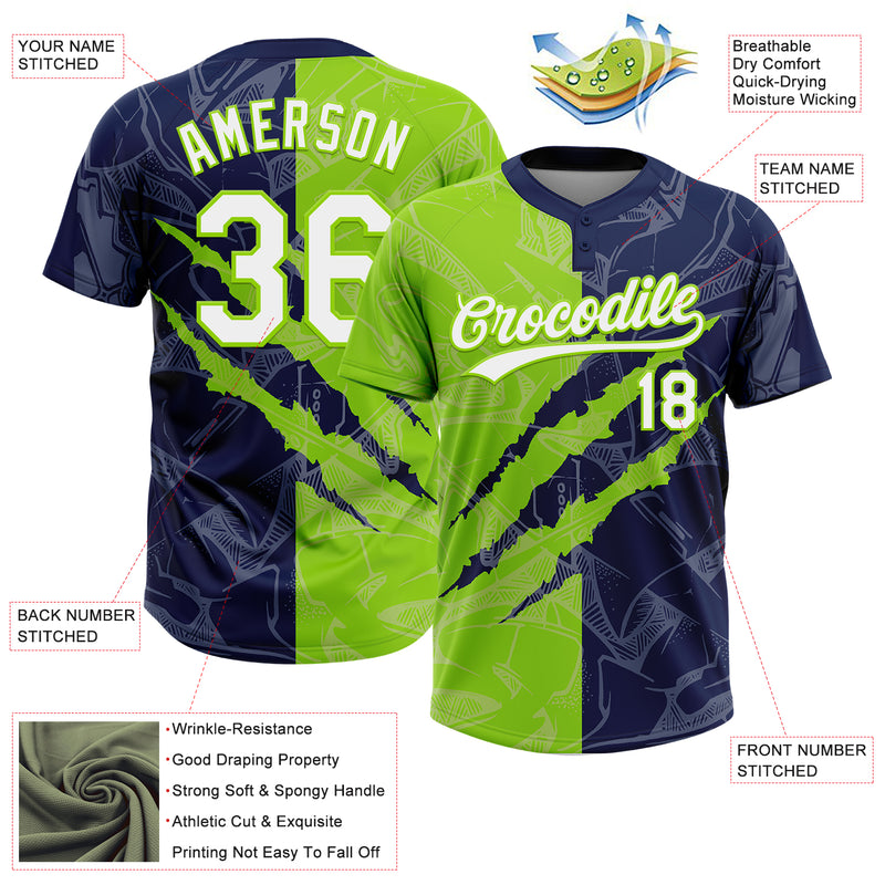 Custom Graffiti Pattern White Navy-Neon Green 3D Scratch Two-Button Unisex Softball Jersey