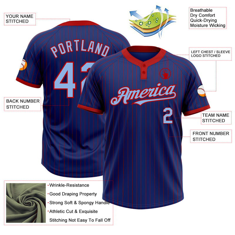 Custom Royal Red Pinstripe Light Blue Two-Button Unisex Softball Jersey