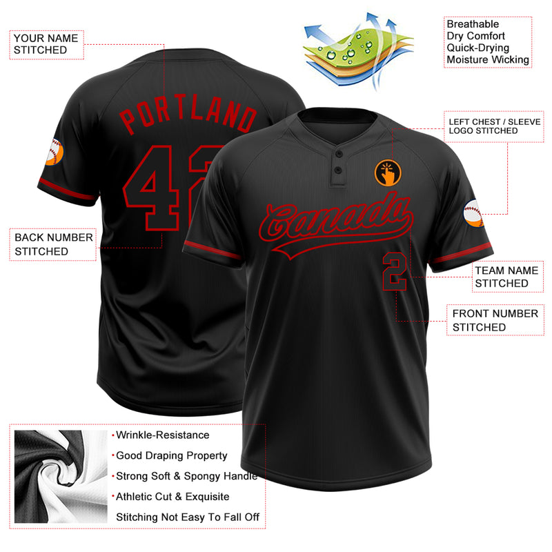 Custom Black Black-Red Two-Button Unisex Softball Jersey