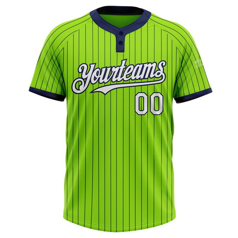 Custom Neon Green Navy Pinstripe White Two-Button Unisex Softball Jersey