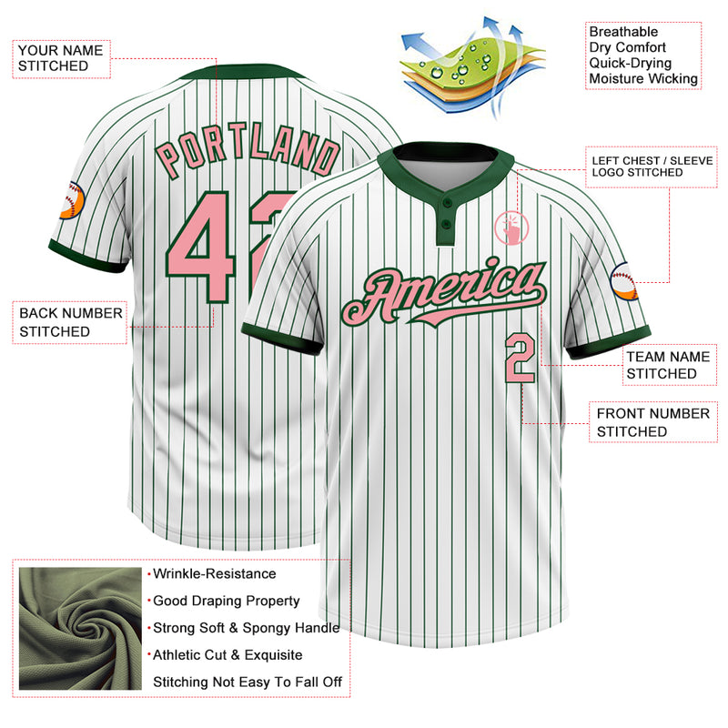 Custom White Green Pinstripe Medium Pink Two-Button Unisex Softball Jersey
