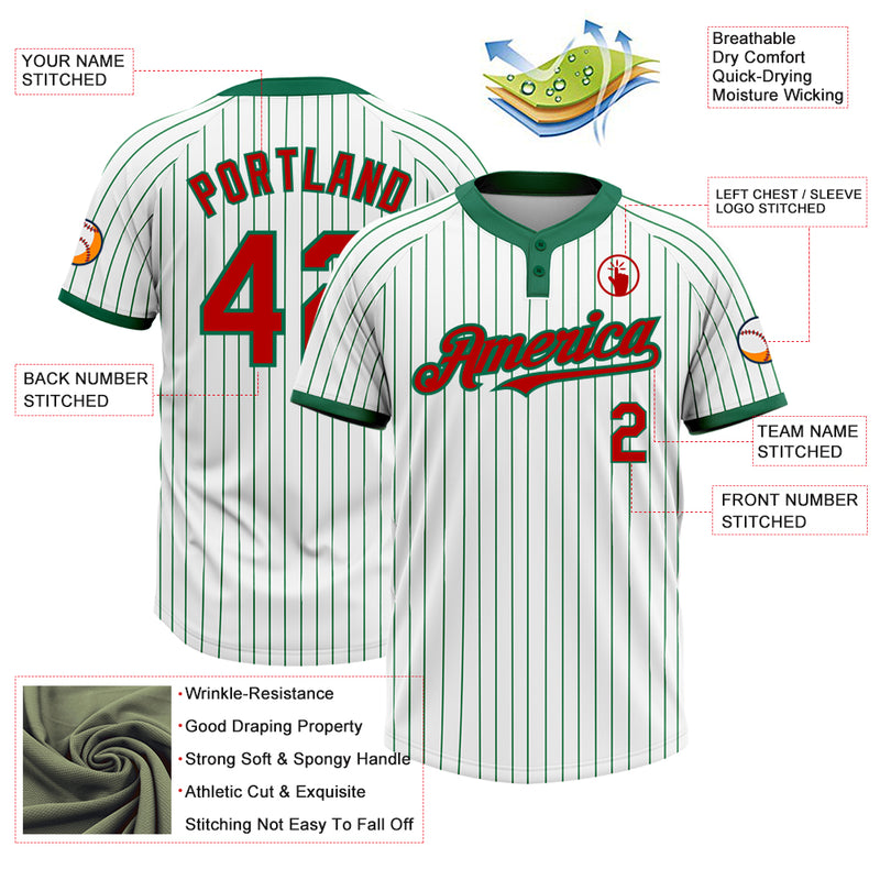 Custom White Kelly Green Pinstripe Red Two-Button Unisex Softball Jersey