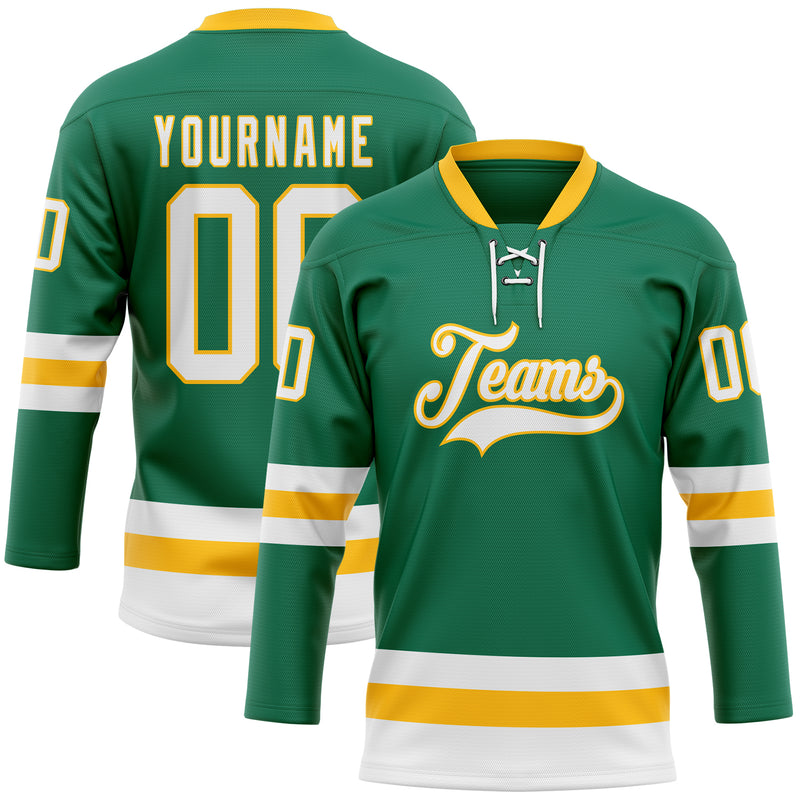 Custom Kelly Green White-Gold Hockey Lace Neck Jersey