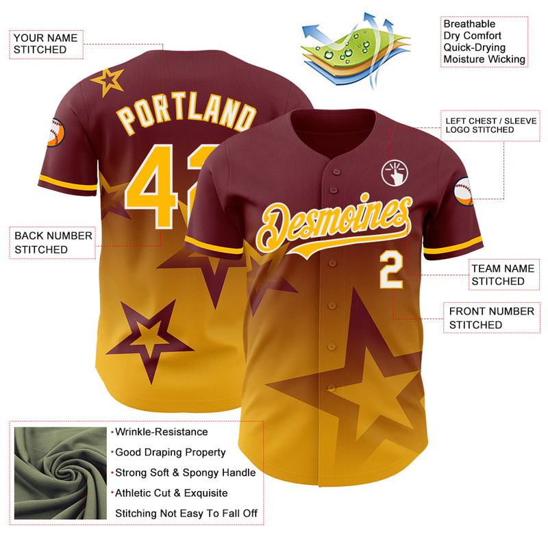 Custom Burgundy Gold-White 3D Pattern Design Gradient Style Twinkle Star Authentic Baseball Jersey