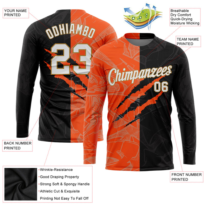 Custom Graffiti Pattern White-Old Gold Scratch 3D Long Sleeve Performance T-Shirt