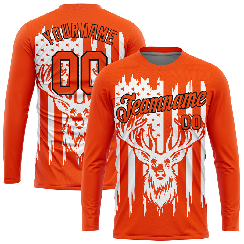 Custom Orange Black-White 3D Animal Deer Hunting American Flag Long Sleeve Performance T-Shirt