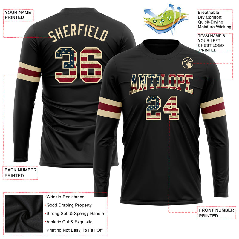 Custom Black Vintage USA Flag Crimson-Cream Long Sleeve Performance T-Shirt