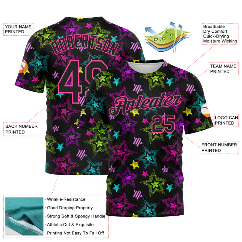 Custom Graffiti Pattern Black-Pink 3D Creative Colorful Stars Performance T-Shirt