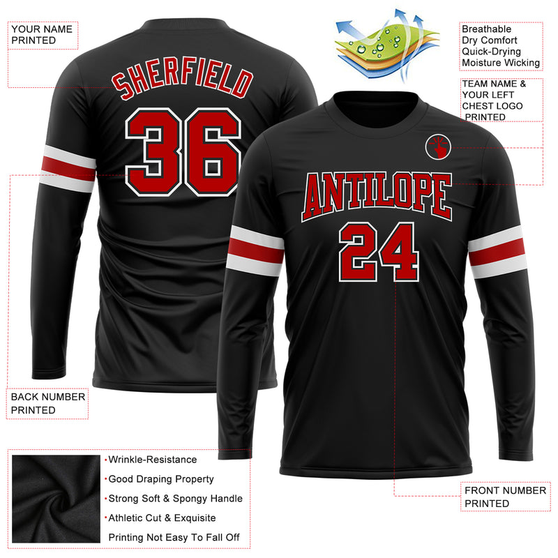 Custom Black Red-White Long Sleeve Performance T-Shirt