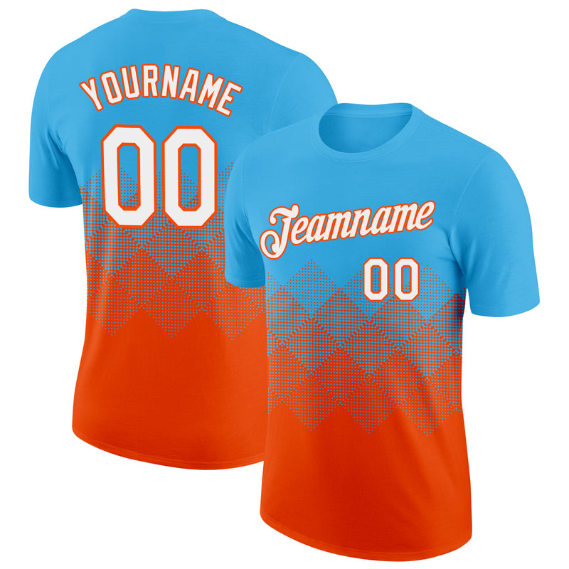 Custom Sky Blue White-Orange 3D Pattern Design Gradient Square Shapes Performance T-Shirt