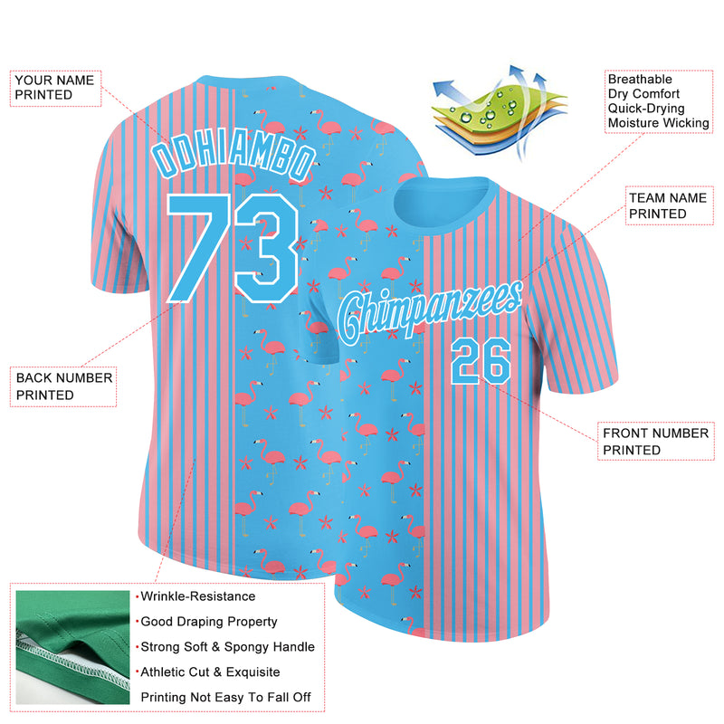 Custom Sky Blue Medium Pink-White 3D Pattern Design Animal Flamingo Performance T-Shirt