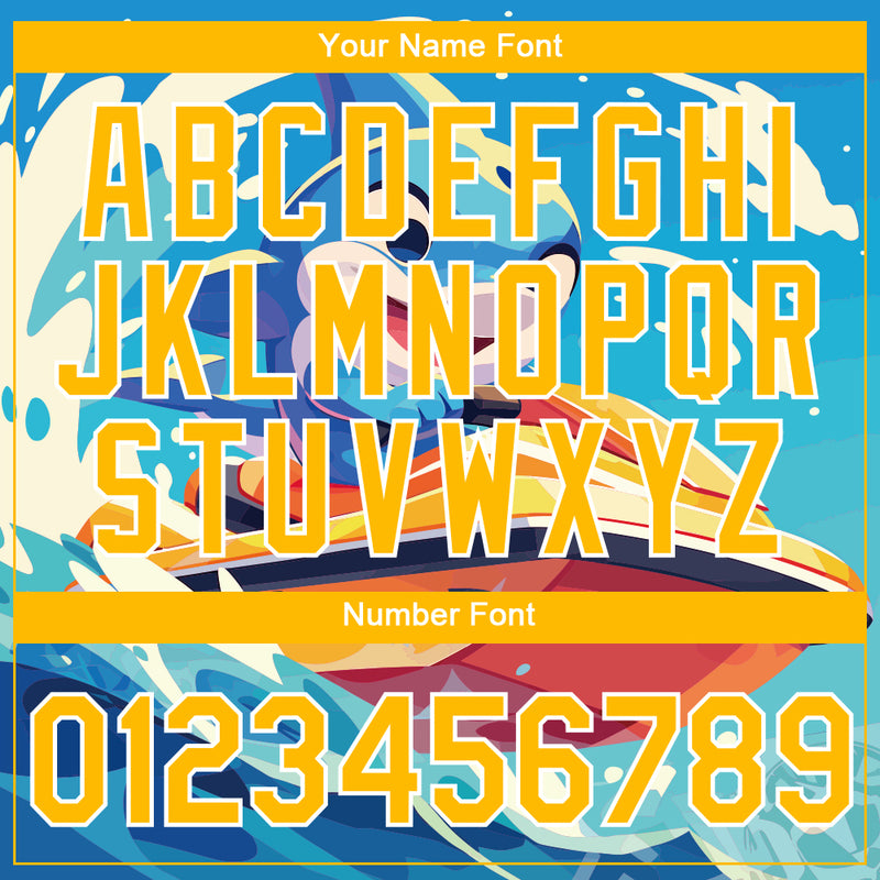 Custom Sky Blue Gold-White 3D Pattern Design Extreme Sport Cartoon Animal Dolphin Surfing Performance T-Shirt