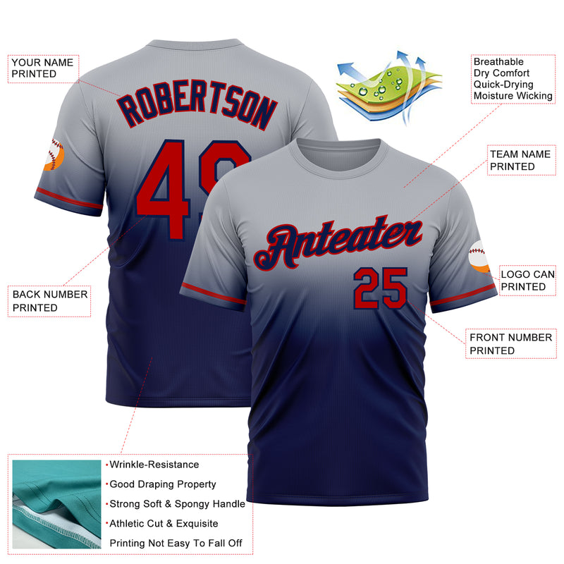 Custom Gray Red-Navy Fade Fashion Performance T-Shirt