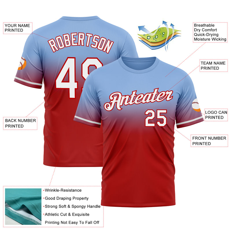 Custom Light Blue White-Red Fade Fashion Performance T-Shirt