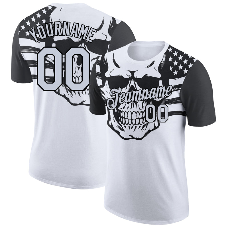 Custom White Black 3D Skull With American Flag Performance T-Shirt