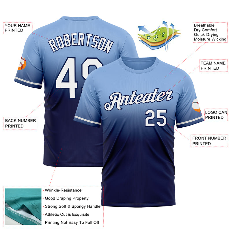 Custom Light Blue White-Navy Fade Fashion Performance T-Shirt