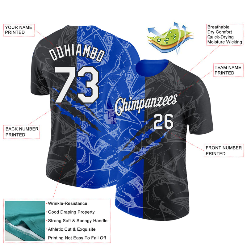 Custom Graffiti Pattern White Black-Thunder Blue Scratch 3D Performance T-Shirt