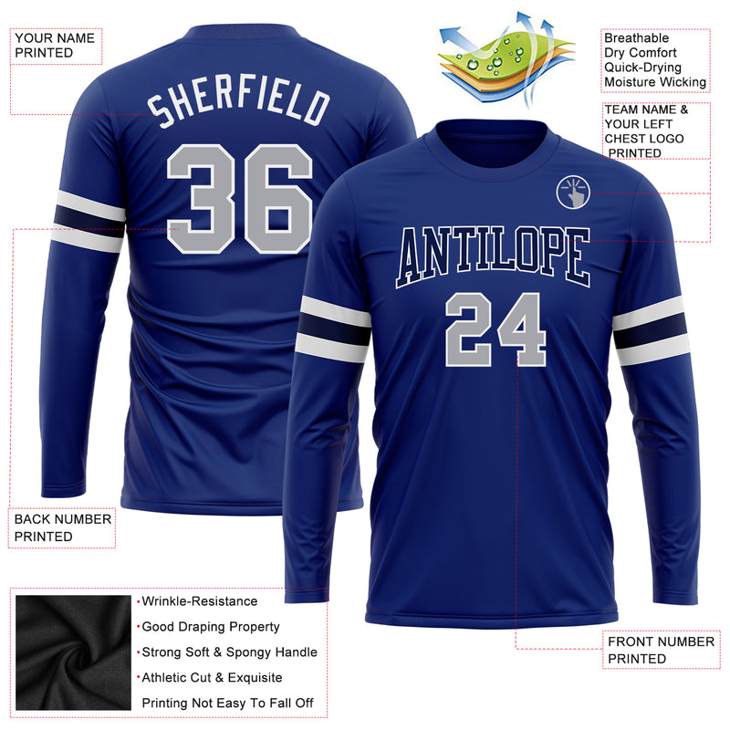 Custom Royal Gray Navy-White Long Sleeve Performance T-Shirt