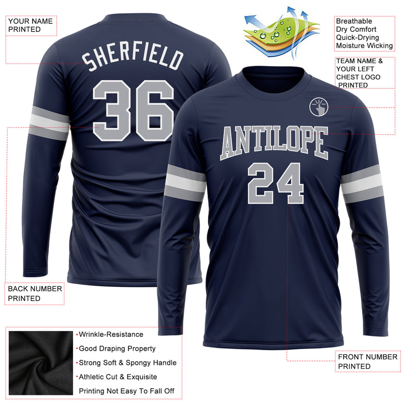 Custom Navy Gray-White Long Sleeve Performance Salute To Service T-Shirt